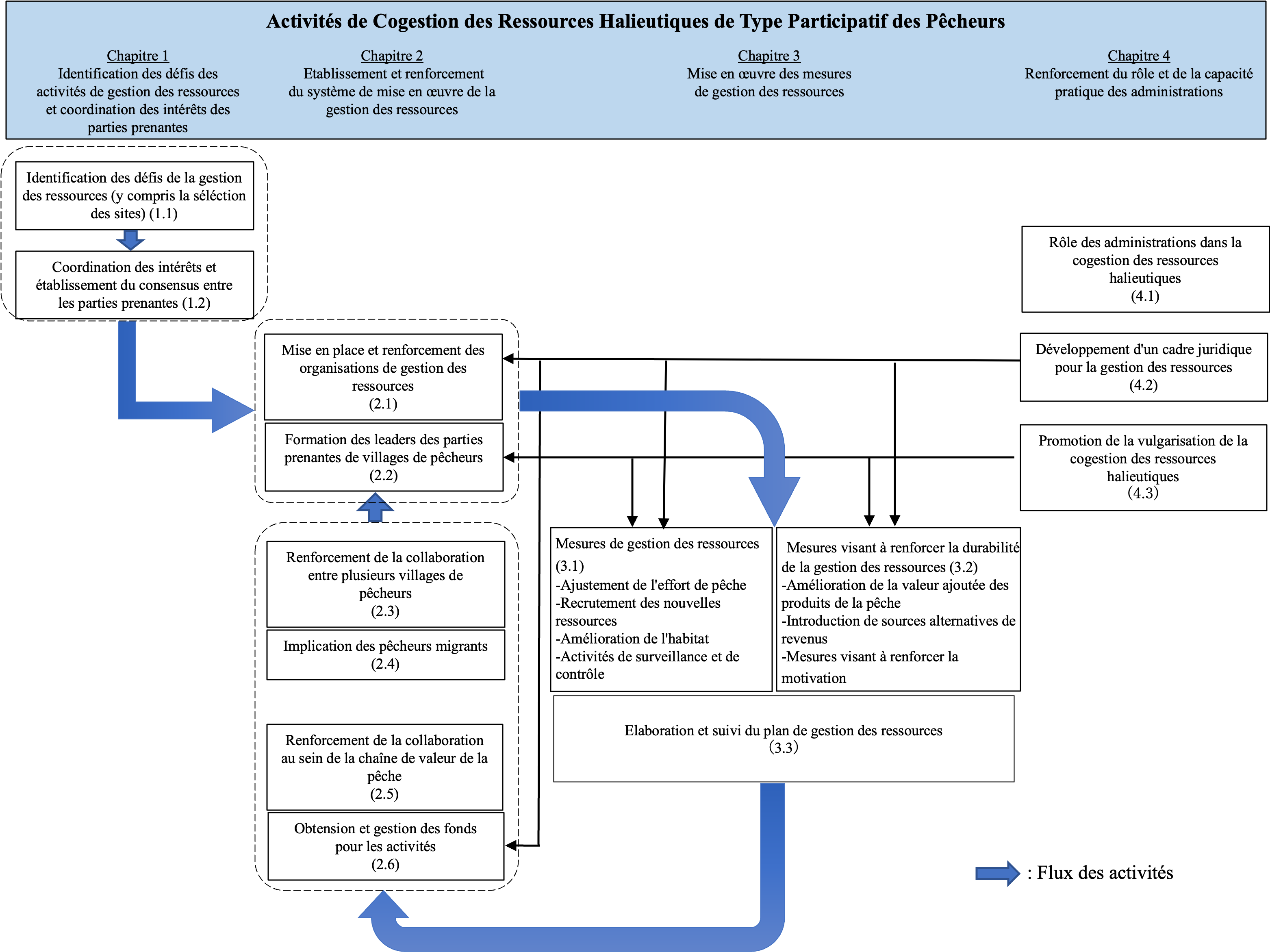 Les administrations en question appuieront les activités de gestion des ressources dirigées par la communauté, notamment l'élaboration d'un cadre juridique pour les règles fixées par les pêcheurs., la gestion organisationnelle et la création de mécanismes permettant d'étendre la cogestion des ressources halieutiques à d’autres zones. À cette fin, il convient de renforcer les capacités des agents de l’administration centrale et des administrations déconcentrées.
